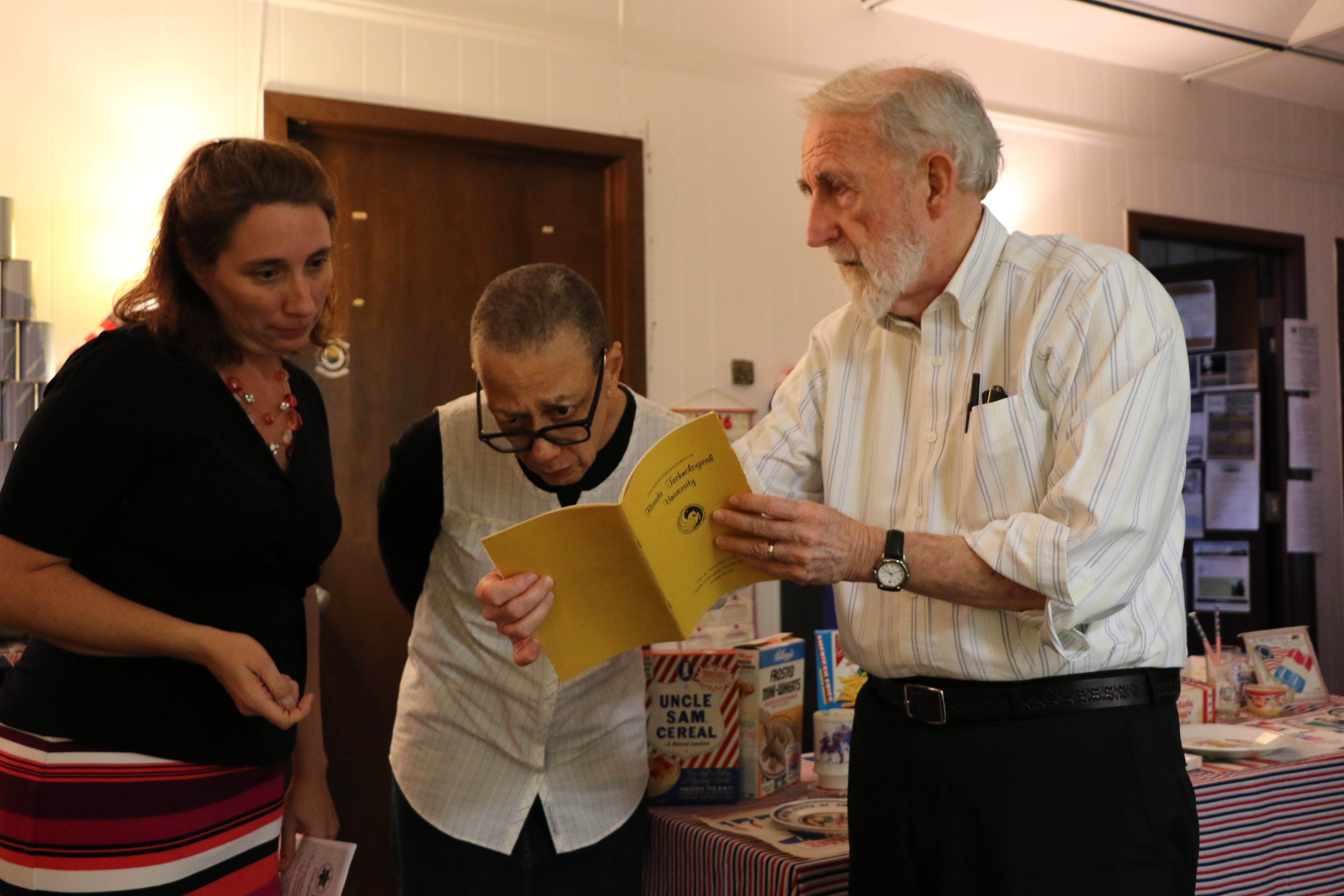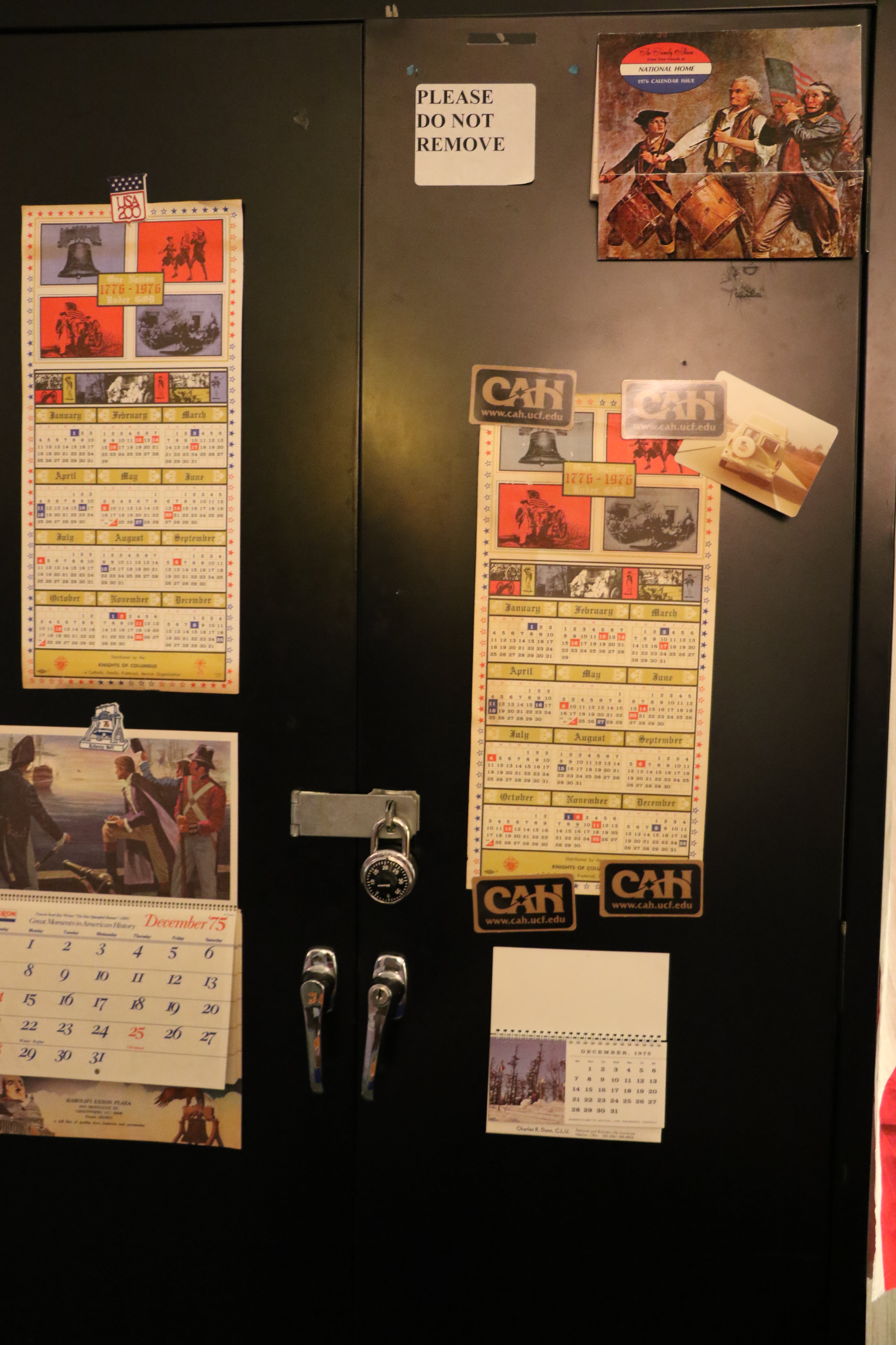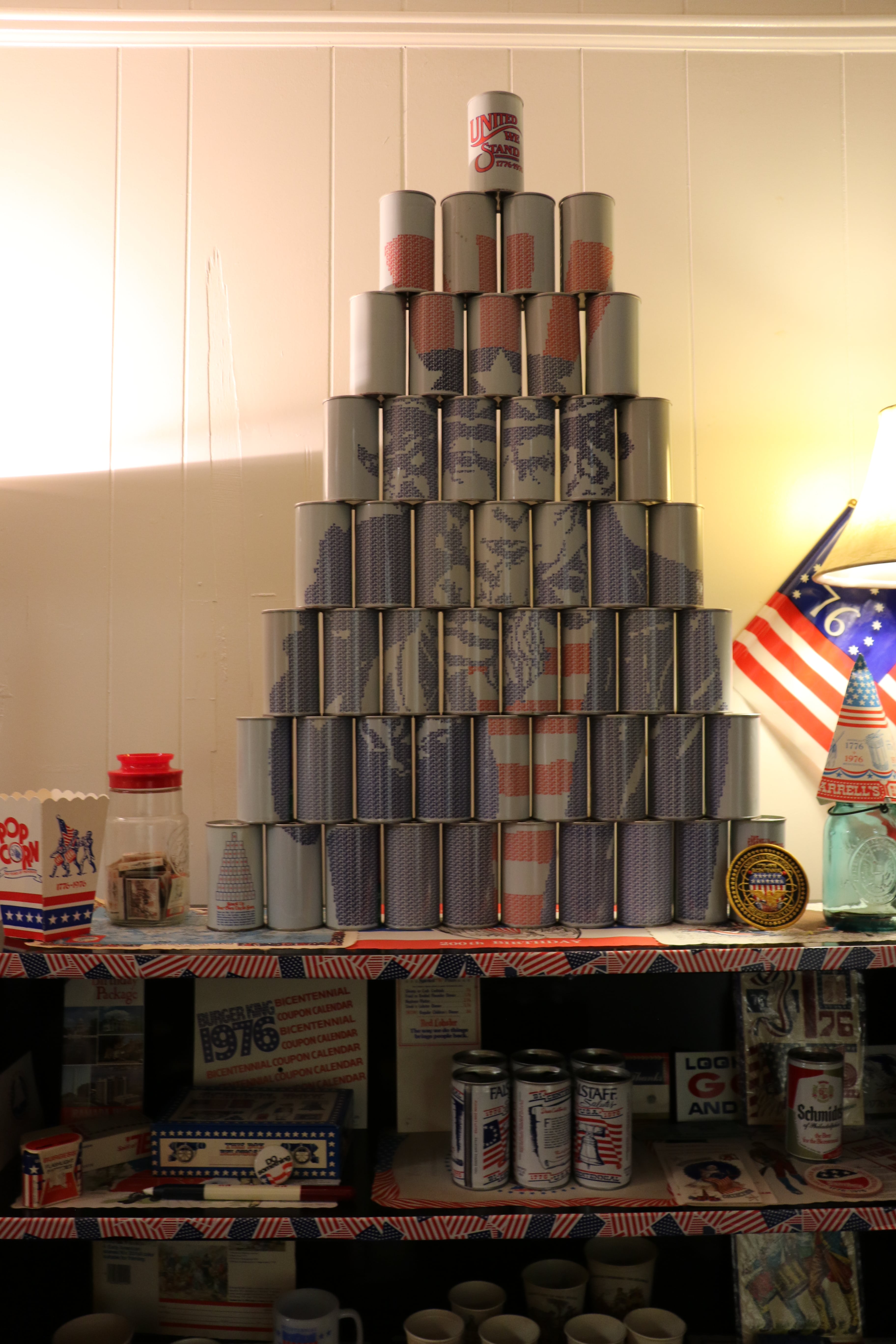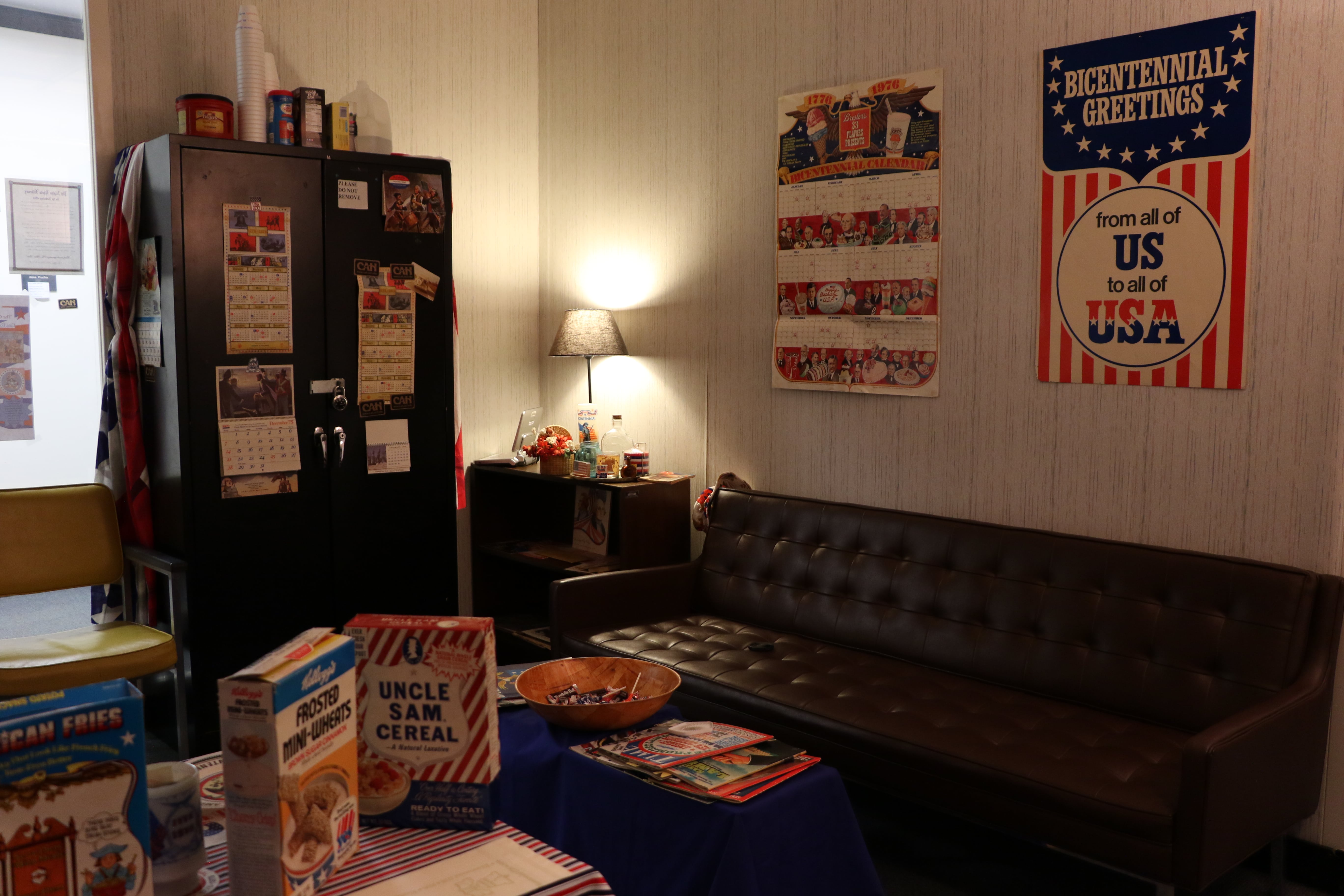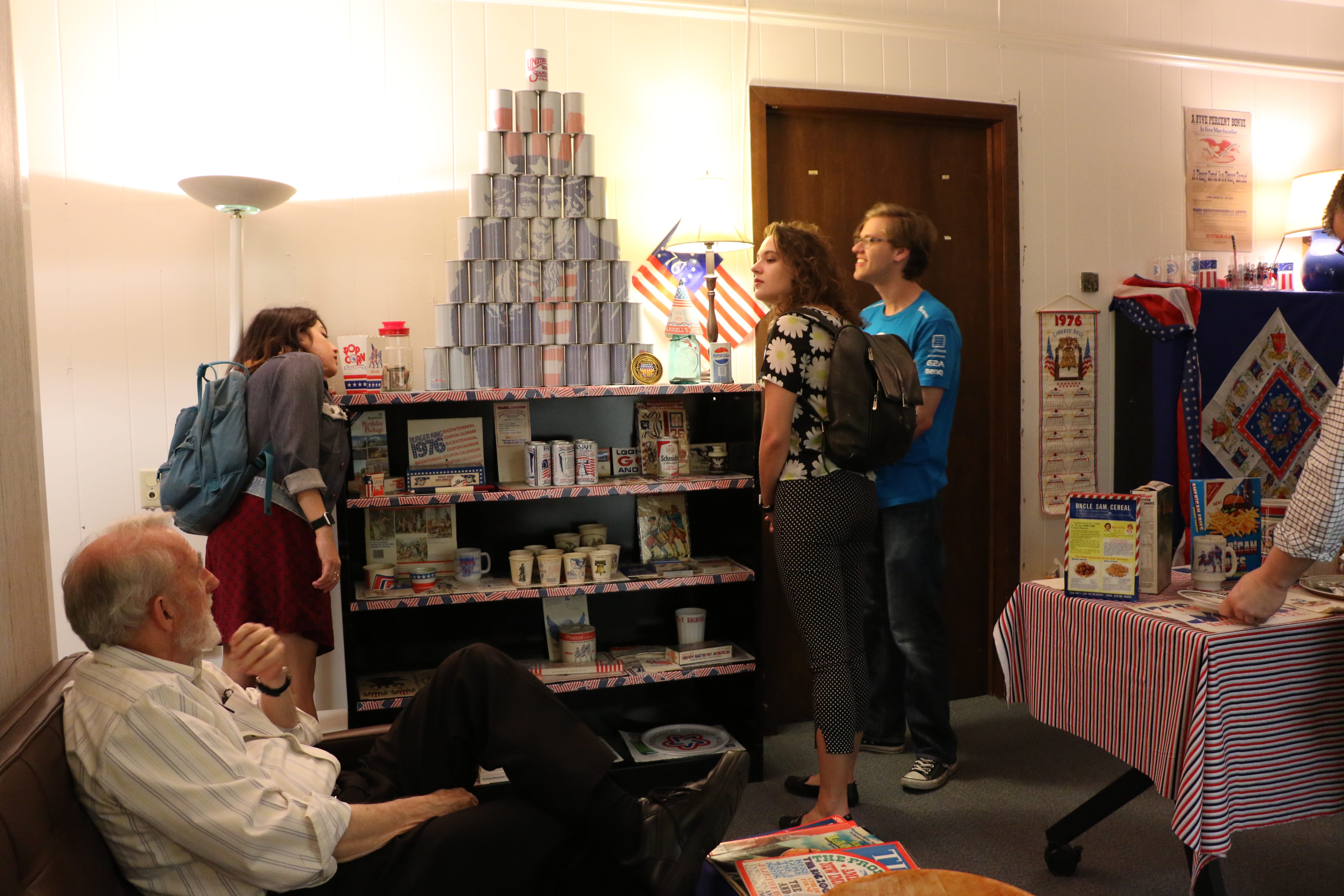 On November 9th and 10th 2016, the Bicentennial Junk Collection was displayed as an exhibit in UCF’s Art in Odd Places. American flag arrows led the way to room 534 in Colbourn Hall. In the hallway of the 5th floor, we displayed the original 1976 TV special of Jean Shepherd’s America featuring Dr. Crepeau. Then, in room 534, we created an immersive 1976 atmosphere complete with objects from the collection displayed everywhere in the room including the star of our show: a 7-up can sculpture of Uncle Sam. Cans, condoms, and condiments, oh my! We hope you were able to catch this rare, eclectic collection!