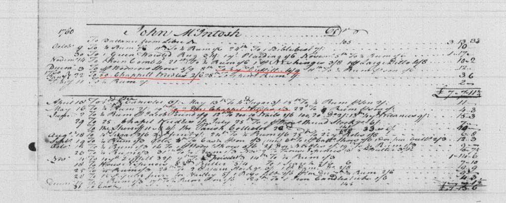 I realized that it was imperative to continue my investigation of Jackson’s purchases to discover the truth behind his identity. As I continued my analysis of Jackson’s account, I attempted to compare documents with another customer that I stumbled across. This individual, like Jackson, acquired similar items. This person was John McIntosh who was more likely to be a tailor based on how he paid his accounts – in the creation and repairs of clothing for Alexander Henderson (the Colchester store manager) and those enslaved by the store.[3]
