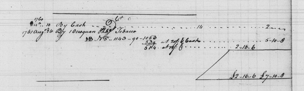 By looking at Jackson’s payments to the Colchester store, it became clear he was not a tailor at all.[4] He may have been connected to Marmaduke Beckwith (a landholder in the western part of Fairfax County) as Jackson’s credits came from selling tobacco notes originally belonging to Beckwith. Was Jackson a tenant of or farm manager for Beckwith? Although I couldn’t confirm what Jackson’s profession may have been by looking at his purchases, by continuing to look at Jackson’s accounts in full, I learned I was wrong in my initial interpretation of him as a tailor based on his fabric purchases and that sometimes it is hard work being a historian!