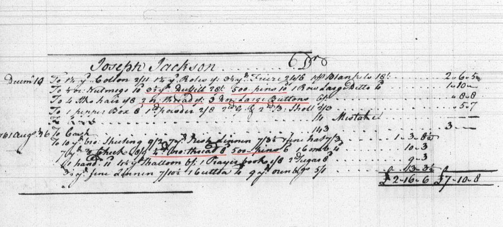 Through McIntosh, I saw some similar purchases: needles and duffle. Knowing that McIntosh purchased his materials at the same store that Jackson did made me wonder if there were any connections. Given the similarity in purchases, perhaps Jackson was a tailor not yet employed, or perhaps he was an apprentice for a tailor and associated with McIntosh on some level. Yet, it was not enough evidence to surmise Jackson’s profession and it continued to be unknown to me. Whatever profession Jackson pursued was not clearly identified by his purchases alone and would take additional research to learn.